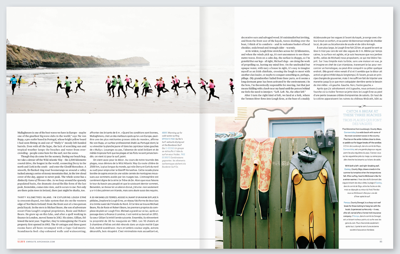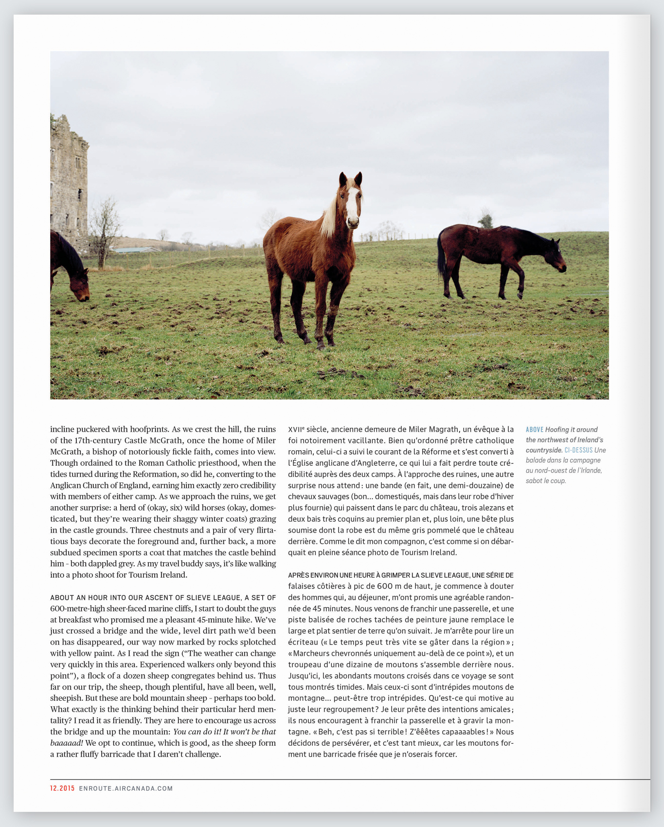 Design, art direction, photo editing, creative commissioning I worked at this agency on the art team of enRoute magazine, the monthly magazine for Air Canda, for over five years. I started as the web intern, then worked as graphic designer, until finally I became deputy art director. As part of a team, I helped commission and plan features and design campaigns; later, my role also involved mentoring junior team members and being responsible for the publication of the magazine.